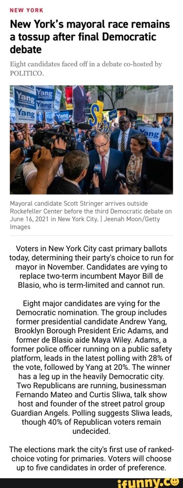 I want a candidate who is going to enforce noise ordinances and quality of life issues like bloomberg did. The city, which elects the mayor as its chief executive, consists of the five boroughs (manhattan, the bronx, brooklyn, queens and staten island). The race to replace new york mayor bill de blasio will cross a key threshold on tuesday as democrats and republicans host their primary elections. The winners will advance to the general election on november 2, 2021. There were 13 candidates in the new york city democratic primary.